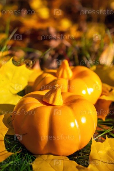 Тыквы на зеленой траве с желтыми и оранжевыми кленовыми листами