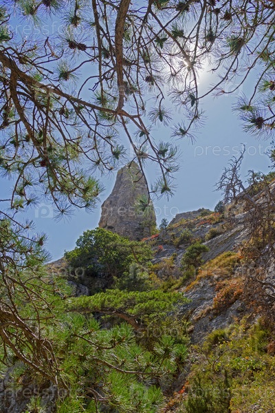 Вид на скалу "Чертов палец" из небольшого ущелья. Крым, Гора Сокол (между Судаком и Новым Светом)