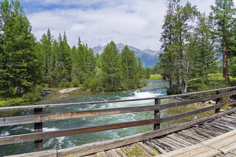 Старый деревянный мост через быструю реку. Река Жомболок, Восточный Саян, Бурятия, Сибирь, Россия