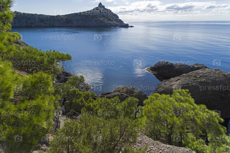 Заросший соснами и можжевельником каменистый морской берег тихим солнечным утром. Голубая бухта, Новый Свет, Крым, сентябрь