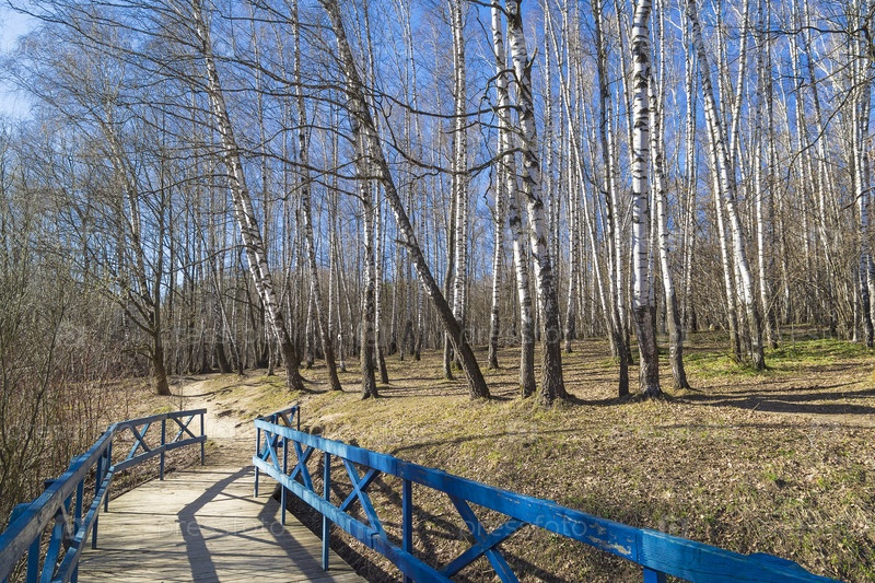 Пешеходный мост проложенный по дну небольшого оврага. Ландшафтный заказник "Теплый стан", Москва, середина апреля, солнечный день