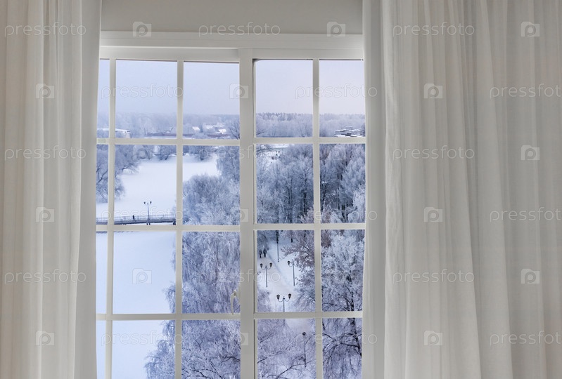 Вид из окна на заснеженные деревья