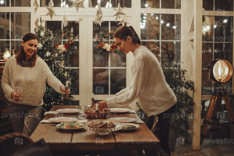 Мать и дочь вместе накрывают праздничный рождественский стол в уютно оформленном деревенском доме