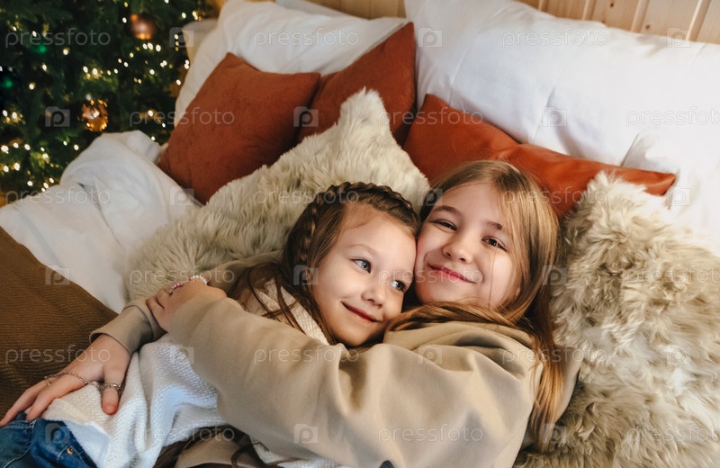 Портрет двух счастливых улыбающихся маленьких девочек-сестер, обнимающихся, проводя время вместе на Рождество
