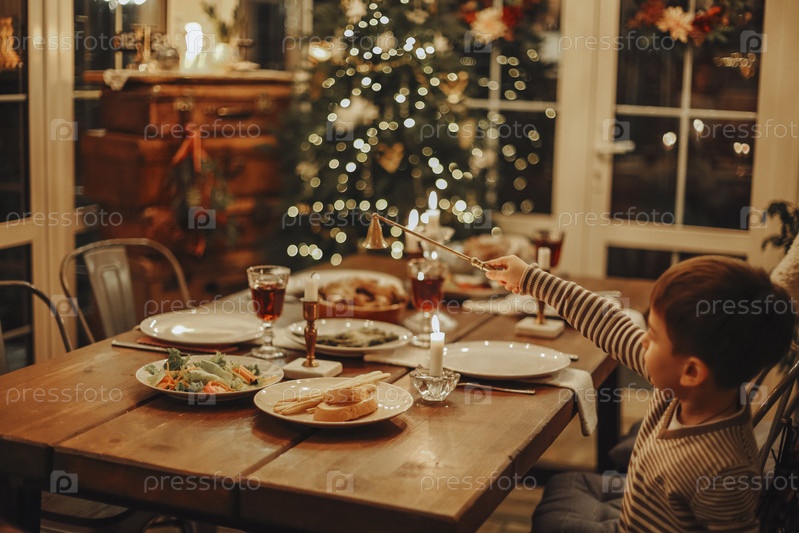Забавный маленький мальчик сидит на рождественском кухонном столе в белом свитере и тушит пламя свечи