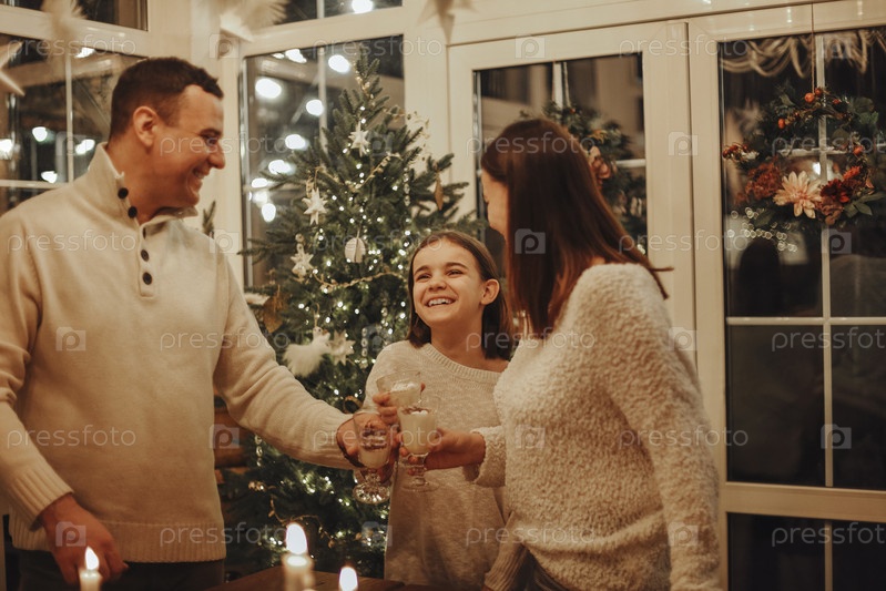 Семья пьет домашний гоголь-моголь у рождественской елки, весело проводя время