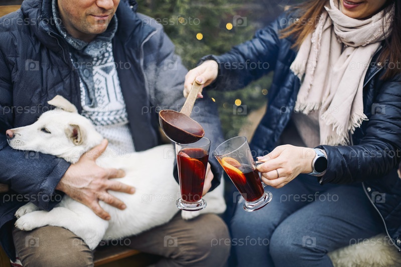 Прекрасная пара с милой собакой сидит на заднем дворе в окружении молодых хвойных деревьев,