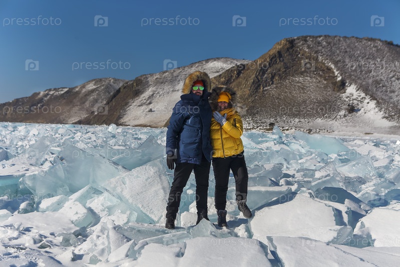 Счастливая пара на замерзшем зимнем озере Байкал