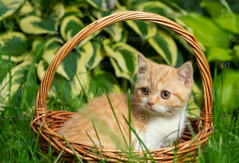 Британский рыжеволосый короткошерстный котенок сидит в корзине на фоне зеленых листьев растения-хозяина