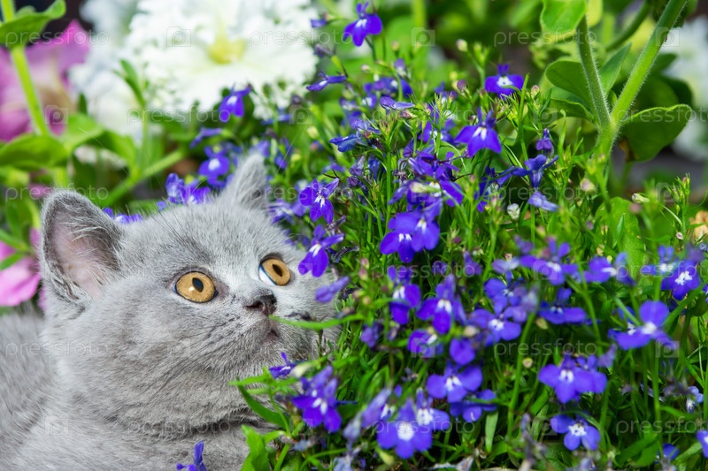 Британский серый короткошерстный котенок сидит на камне в траве крупным планом