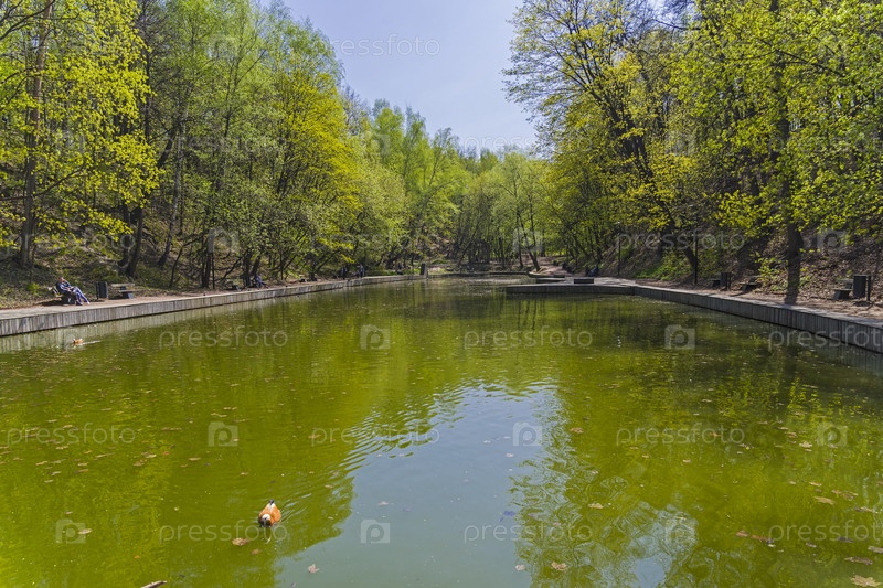 Пруд в парке весенним солнечным днем. Нескучный Сад, Москва, Россия, начало мая