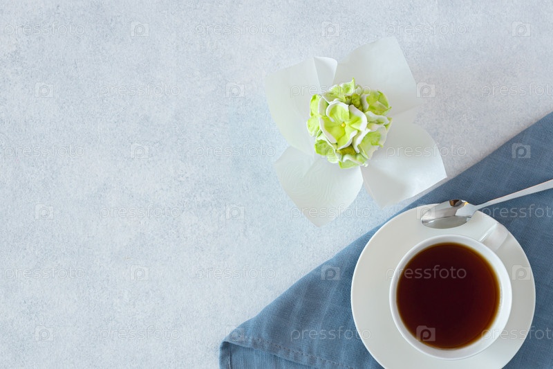 Чайный сервиз в композиции с цветами алтея. вид сверху, копия пространства. Кофейная кружка на блюдце. на светло-сером фоне