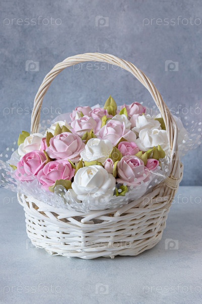 Зефирный букет цветов в корзине на сером фоне. кондитерские изделия собственного производства. здоровая и красивая еда