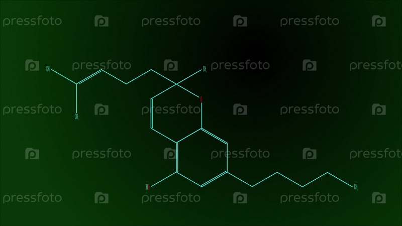 Структурная формула молекулы каннабихромена. Черный и зеленый градиент фона