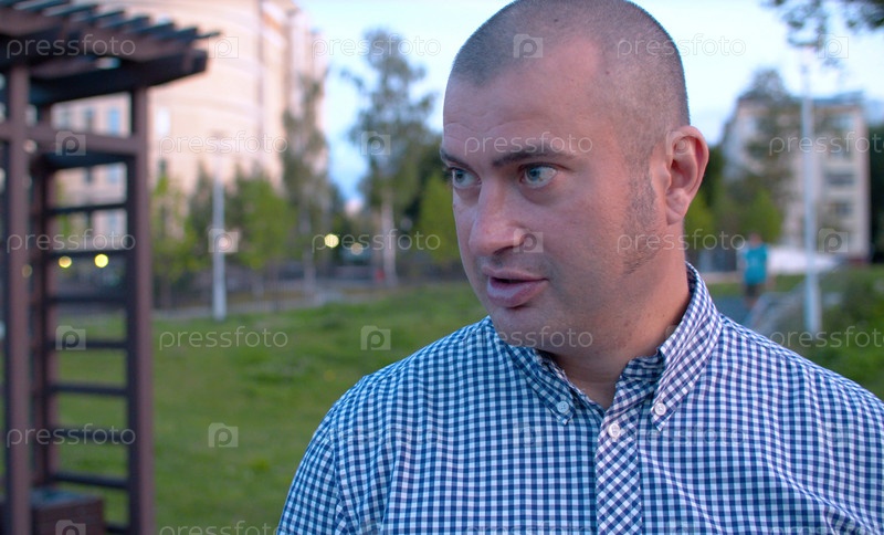 Крупный план портрета мирного сильного мужчины, сидящего в парке