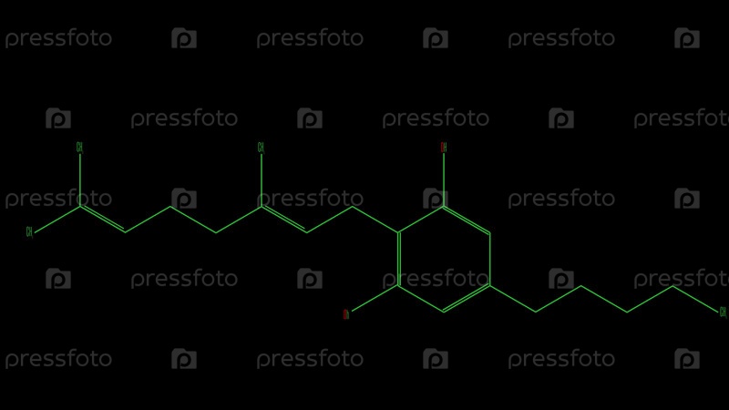 Структурная формула молекулы каннабигерола. Черный фон