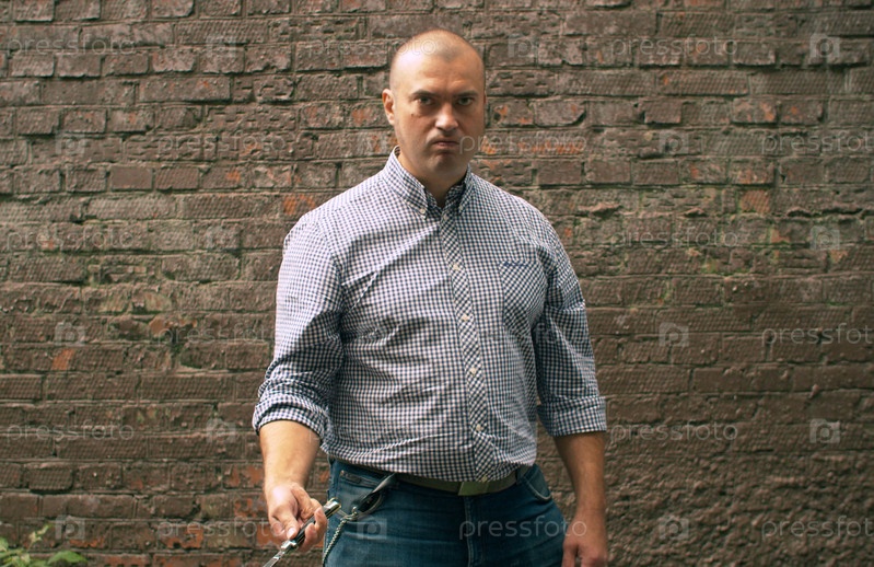 Бандит угрожает ножом кирпичной стене