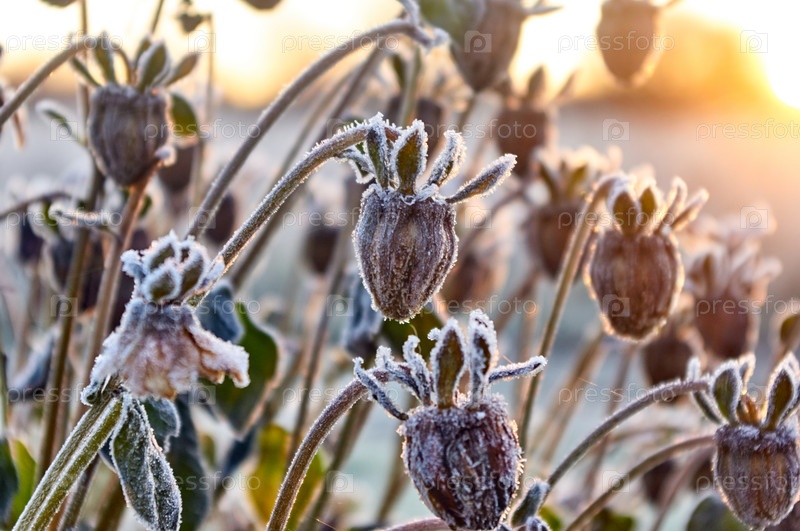 Замерзшие бутоны цветов в лучах восходящего солнца
