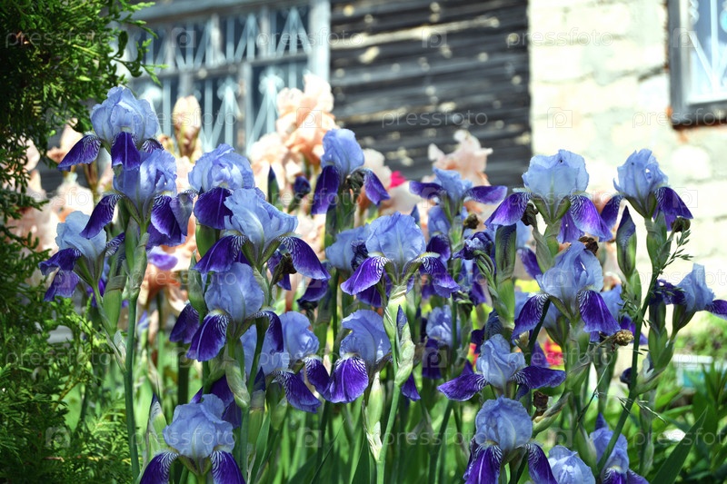 Голубые ирисы на фоне деревянного деревенского дома