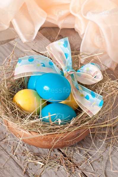 Пасхальные яйца в гнезде на деревянном фоне