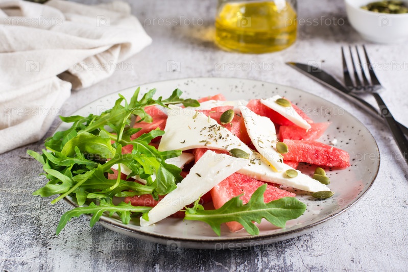 Свежий салат из арбуза, сыра фета, рукколы и тыквенных семечек на тарелке. Органическая диета