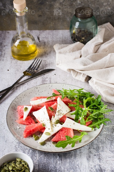 Домашний салат из сыра фета, арбуза и рукколы на тарелке. Органическая диета. Вертикальный вид
