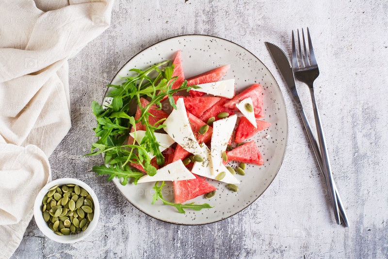 Свежий салат из арбуза, сыра фета, рукколы и тыквенных семечек на тарелке. Органическая диета. Вид сверху