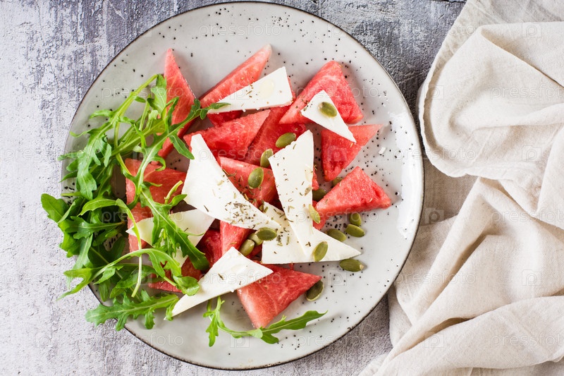 Свежий салат из арбуза, сыра фета, рукколы и тыквенных семечек на тарелке. Вид сверху. Крупный план