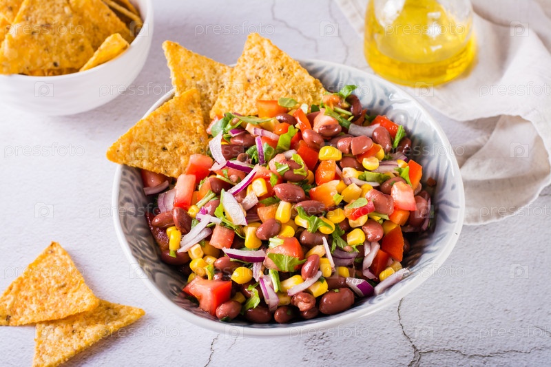 Домашняя ковбойская икра, традиционный мексиканский овощной салат и начос в миске на столе