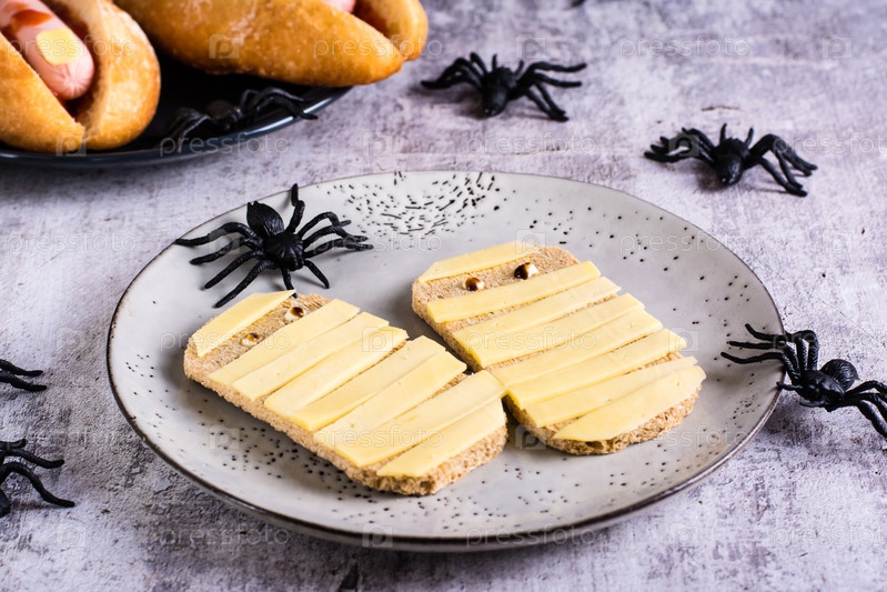 Две мумии из тостов и сыра на тарелке. Рецепт Хэллоуина