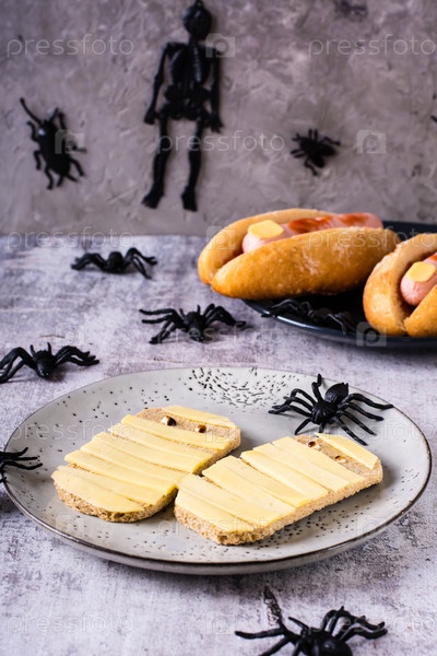 Две мумии из тостов и сыра на тарелке. Рецепт Хэллоуина. Вертикальный вид