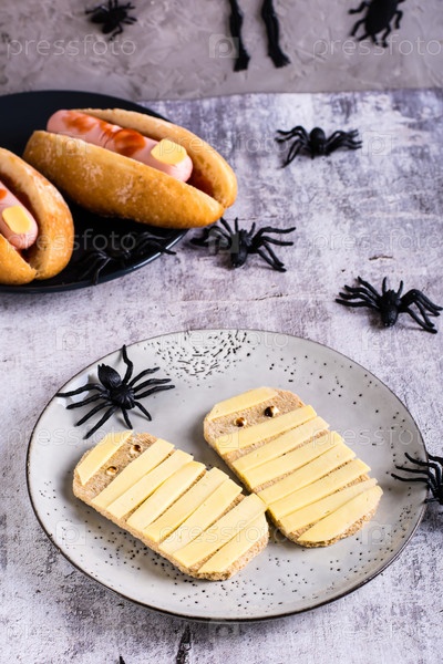 Тосты с сыром в виде мумий на тарелке и пауков. Рецепт Хэллоуина. Вертикальный вид