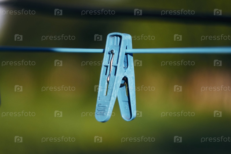 Голубая, бельевая прищепка висит на веревке