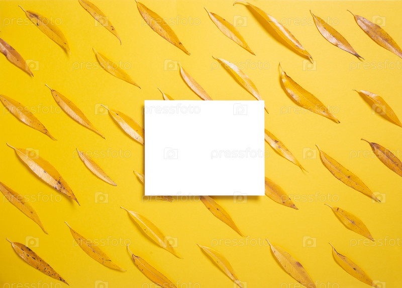 Пустая приподнятая прямоугольная рамка макет и осенние листья ивы на желтом фоне. Шаблон для дизайна. Скопируйте пространство
