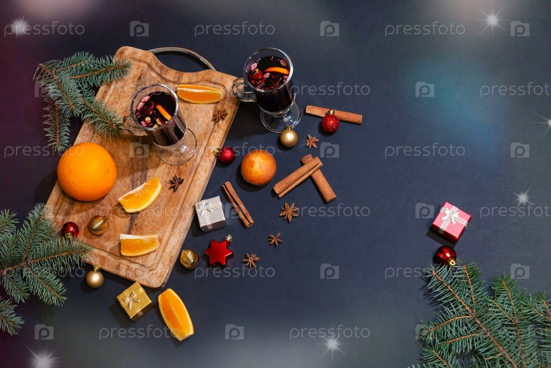 Глинтвейн, еловые ветки, подарки, специи и рождественские украшения. Вид сверху, пространство для копирования