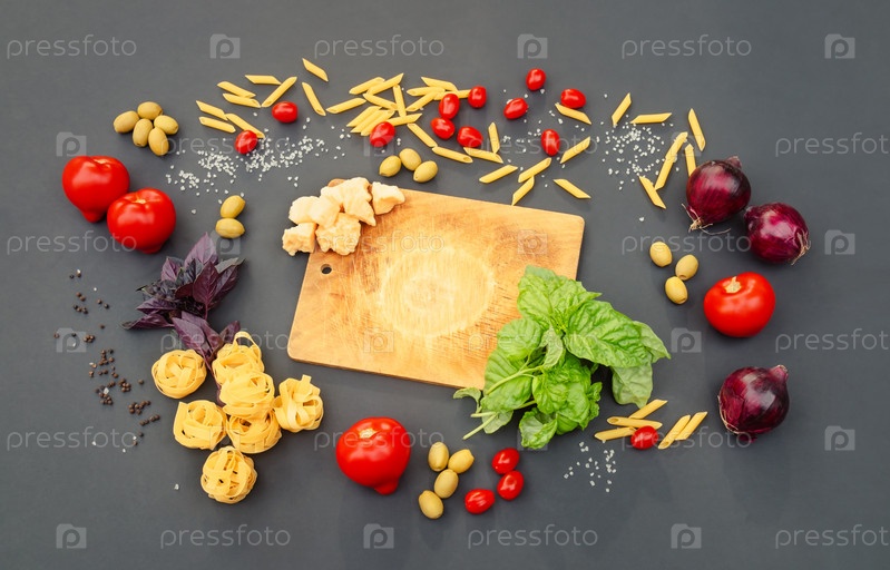Разделочная доска, свежие овощи, сырая паста, сыр, базилик, зеленые оливки и специи на темном фоне
