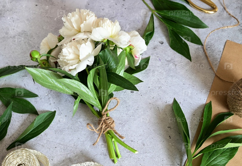Женщина делает букет пионов, букет из крафт бумаги., обрезка цветов, столпник делает букет