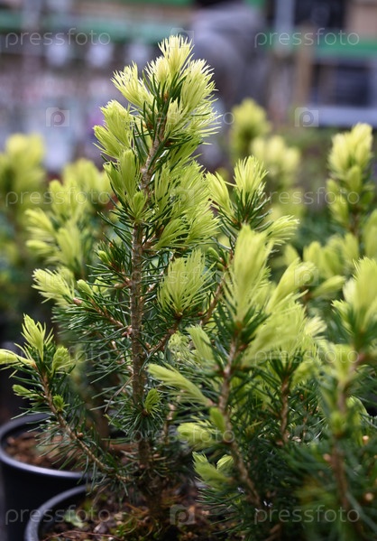 Молодые побеги ели. Макросъемка. Дикая лесная природа. Размытый фон