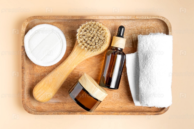 Вид сверху на деревянный поднос со средствами по уходу за лицом. Косметическое масло и дневной крем в темной стеклянной упаковке. Щетка для лица и хлопковое полотенце. Курортное лечение. Органическая косметика