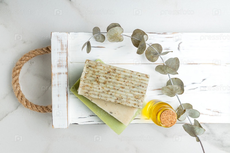 Концепция безотходной косметики. Плоская планировка, вид сверху на натуральное, органическое твердое мыло ручной работы и ветку эвкалипта поблизости. Концепция органической косметики спа