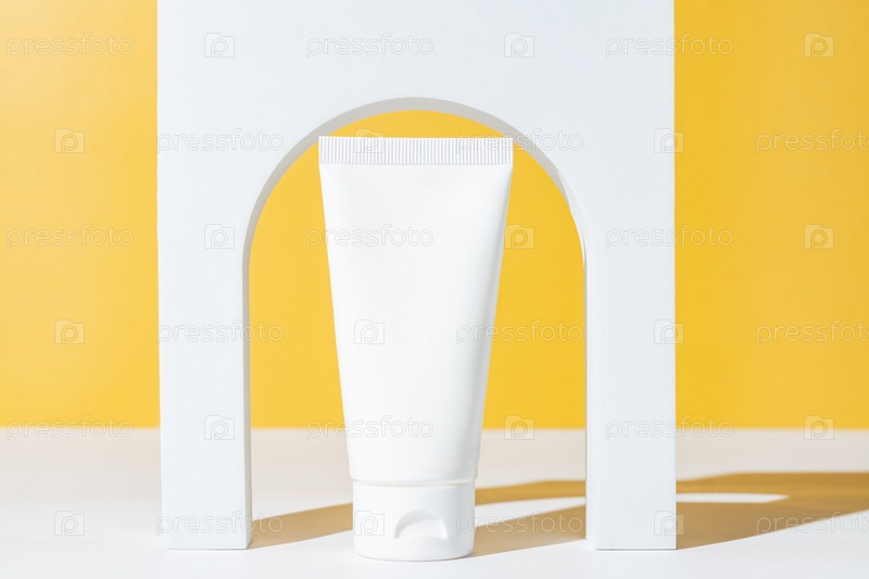 Пустая белая пластиковая косметическая трубка и белый арочный подиум на желтом фоне. Уход за кожей, косметические процедуры, спа-концепция. Модная витрина косметической продукции