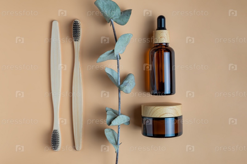 Комплект личной гигиены. Аксессуары для ванны и ухода за кожей. Ежедневный натуральный органический уход за телом, органические продукты для ванн. Бамбуковые зубные щетки, крем для лица и сыворотка в задней части из темного стекла с бамбуковой крышкой