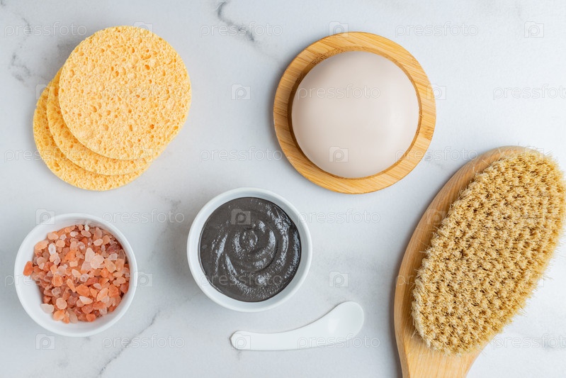 Концепция красоты и спа - массажная щетка для тела, глиняная маска, мыло, губка конжак и розовая гималайская соль на мраморном столе, вид сверху