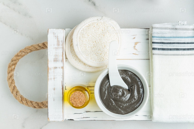 Органическая косметическая черная глина, эфирное масло и губки луфы на белом текстурированном подносе. Концепция спа-салона и оздоровления. Вид сверху