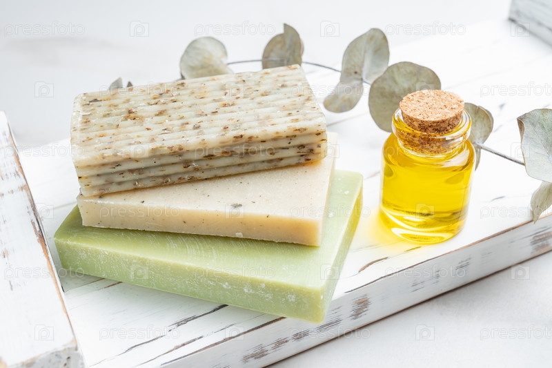 Органическое натуральное мыло с экстрактами растений, мыло ручной работы на деревянном подносе с эфирным маслом и веткой эвкалипта. Домашняя натуральная косметика