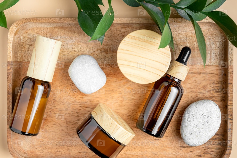 Набор натуральной косметики для лица и тела. Небрендированные пипетки-пипетки из темного стекла с баночками для сыворотки и крема в уютной лайфстайл-атмосфере. Естественный экологический тренд