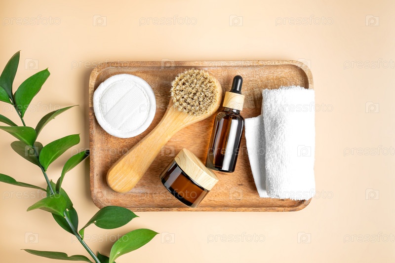 Бутылки косметики из янтарного стекла на деревянной подносе с листьями рускуса и белыми полотенцами. Набор натуральных органических косметических средств SPA на бэжевом фоне, вид сверху. Концепция ухода за кожей тела и лица