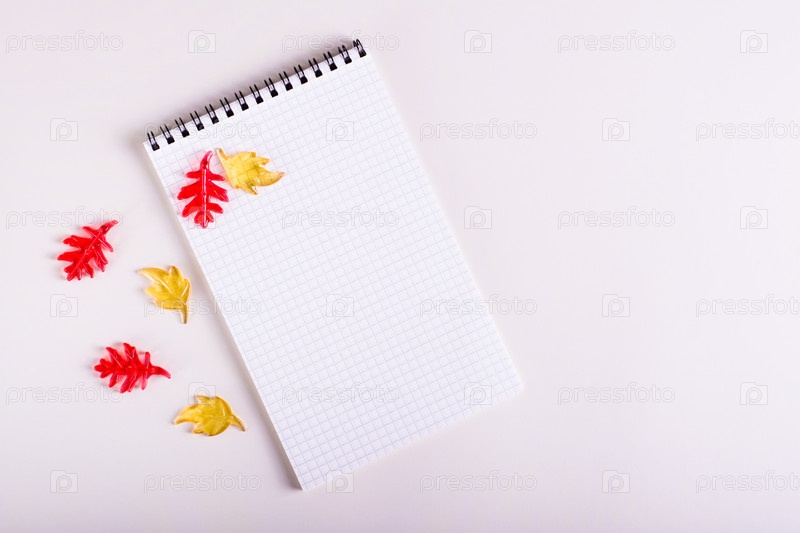 Осенний натюрморт пустой блокнот и цветные листья на розовом фоне. Вид сверху
