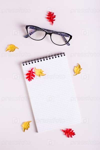 Осенний натюрморт пустой блокнот, очки и цветные листья на розовом фоне. Сверху и по вертикали