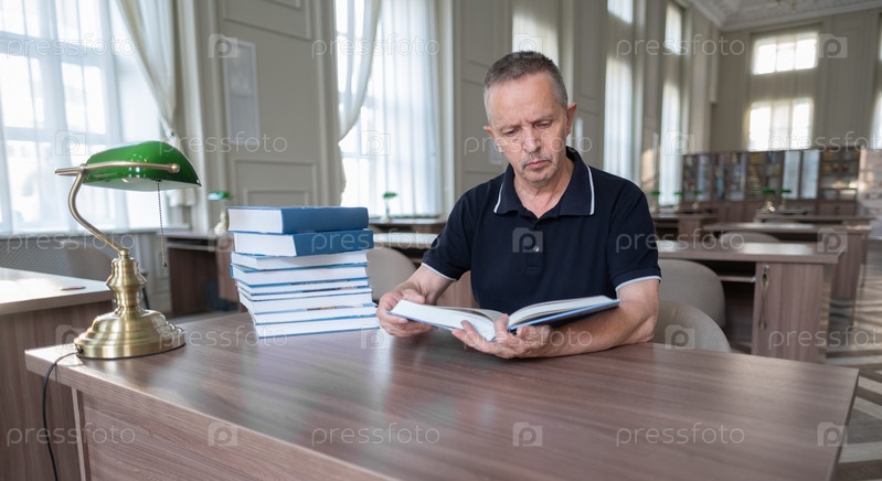 Портрет кавказского пожилого человека, работающего с книгой в публичной библиотеке